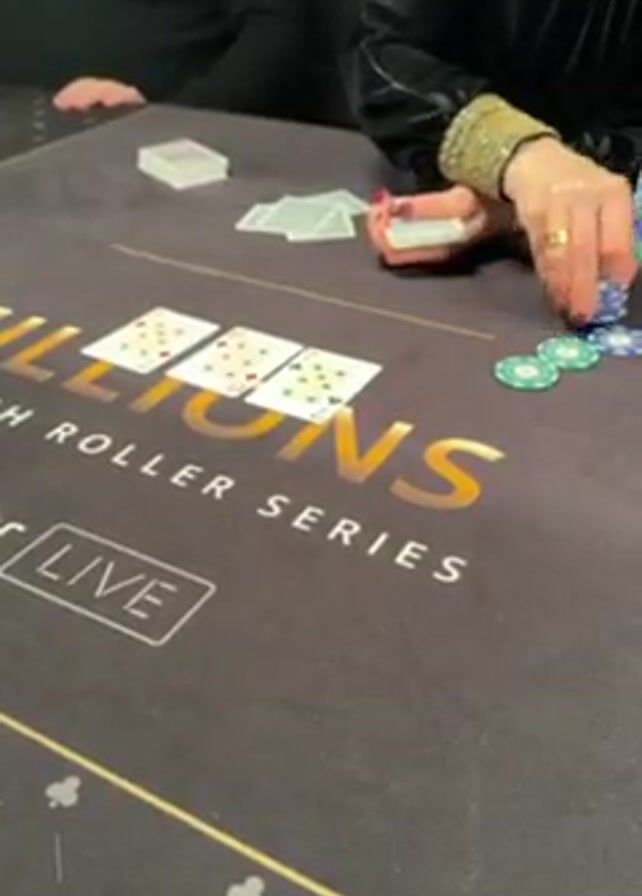 poker table with the text "Millions High Roller Series LIVE" printed on it. Three cards are laid face-up: a 7 of hearts, a 6 of diamonds, and a 7 of diamonds. A woman is seen stacking poker chips on the right side of the table. A man sits to her left, out of focus. The woman is wearing a black, long-sleeved top with gold embellishments. There are some cards stacked face-down at the top of the table, as well as some other cards.