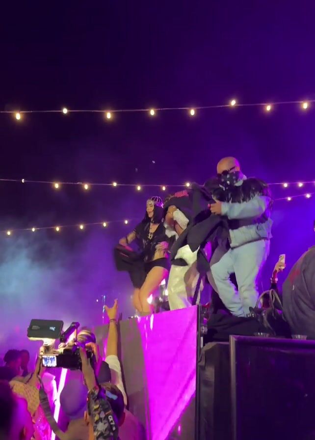 live musical performance at night. Three individuals stand on a stage-like platform, backlit by bright purple and white lights. One performer wears a black outfit and a jeweled headpiece. Another is dressed in a white top and loose pants, with light skin and curly hair. The third person wears a light denim jacket with black feathers attached to the shoulders, denim pants, and a face covering. All three appear to be dancing and interacting with each other, gesturing with their hands. Below them, a crowd of people is visible, many holding up their phones to record the performance. A professional camera with a lens and external microphone is prominent. String lights are suspended above the scene, adding to the festive atmosphere. Smoke or fog effects are being used, partially obscuring the scene.