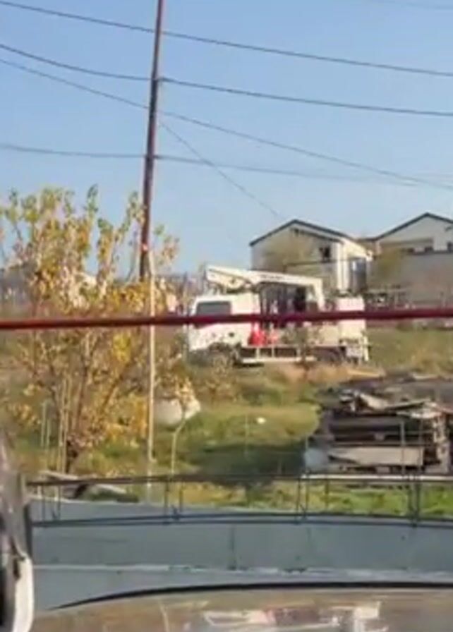 The camera is on a vehicle, likely a car, as it films across an open grassy lot towards a group of people standing near a house