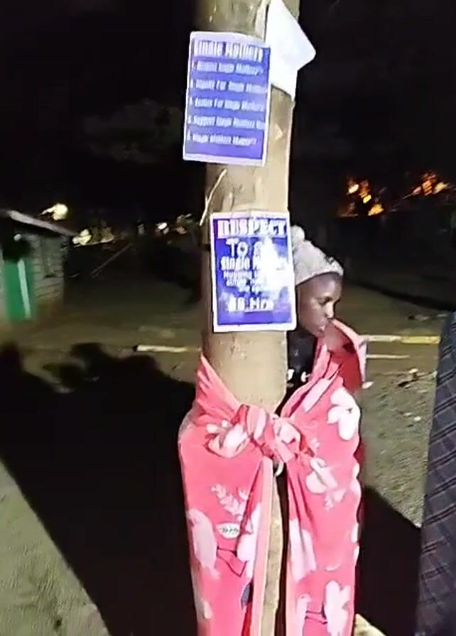 The video depicts a young individual, wrapped in a pink blanket with a floral pattern, standing against a tree at night