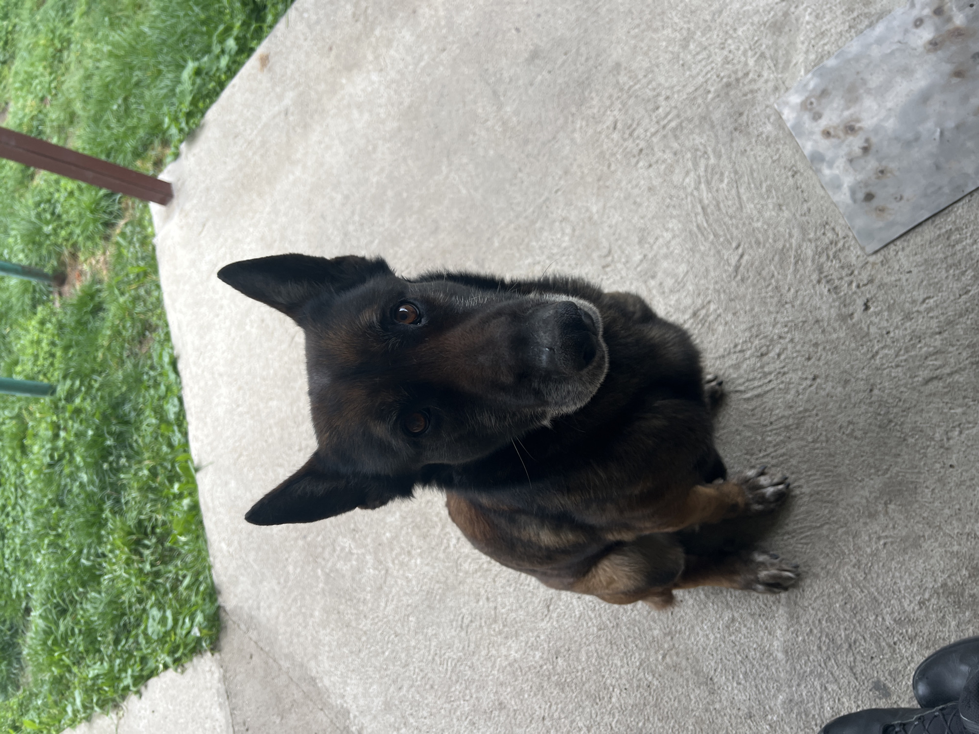 A medium-sized, dark-furred dog with erect ears is sitting on a light gray concrete surface. The dog is looking up and to the side, directly at the viewer. Part of a lawn and a railing are visible in the background on the left. There's a piece of metal with stains on the concrete to the right of the dog. A pair of dark shoes are visible in the bottom right corner. The location is outdoors, potentially a patio or porch. This scene does not contain enough information to definitively place it within the city of Svilengrad, Bulgaria.