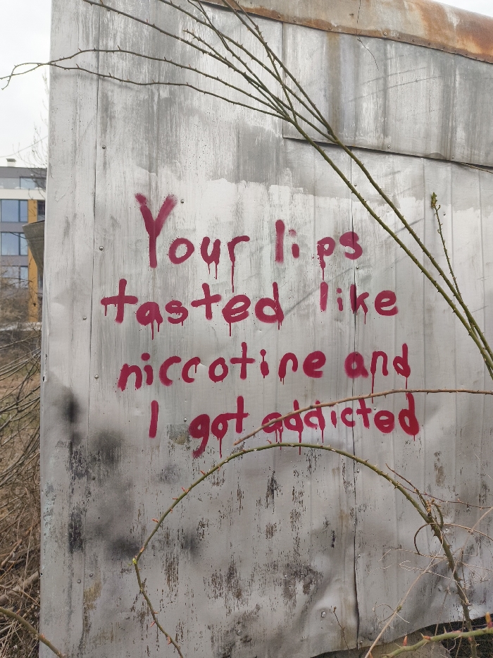 The scene captures a corrugated metal wall, likely part of a temporary structure or shed, situated in an urban area of Sofia, Bulgaria. The wall surface is a weathered, dull silver-gray, exhibiting streaks of dirt, minor indentations, and what appears to be rust along its top edge. Centrally located on this wall is a three-line graffiti message, applied in drippy red spray paint, which reads: "Your lips tasted like nicotine and I got addicted." The red paint exhibits noticeable vertical drips, particularly beneath the letters 's' in 'lips', 'tasted', 'nicotine', and 'addicted'. Bare, thorny branches, devoid of leaves, extend into the frame from the upper right and curve across the lower foreground, indicating dormant vegetation characteristic of late autumn or winter. To the left of the metal wall, in the background, a modern building with multiple rectangular windows and a light-colored facade is partially visible under an overcast sky. The immediate ground to the left of the structure displays dry, brown, sparse vegetation. No individuals or animals are present in the image.