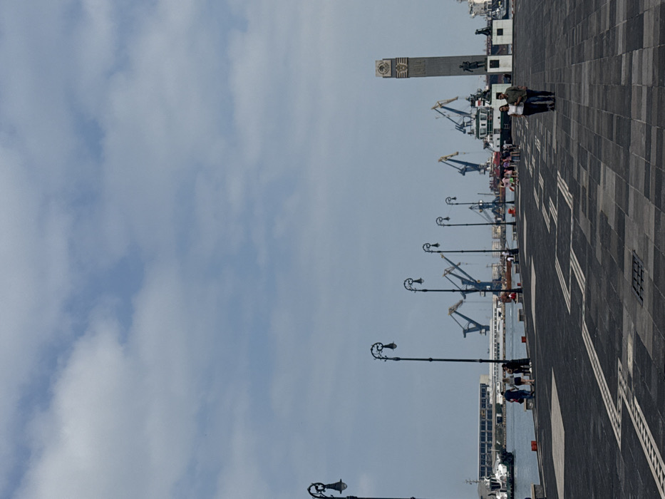 A waterfront scene features a paved walkway adjacent to a harbor. Several lampposts line the walkway, while cranes, ships, and a clock tower are visible along the port. People stroll along the walkway, and a slightly overcast sky provides a backdrop for the industrial and urban landscape.