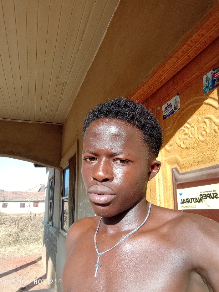 A young, dark-skinned male is captured in a close-up, slightly off-center portrait shot outdoors in Rido, Nigeria. He stands bare-chested, wearing a silver-colored chain with a cross pendant, and has short, dark, curly hair. His skin, particularly on his forehead and shoulders, reflects bright sunlight, indicating strong illumination from the left. The immediate background to his right features a dark brown, carved wooden door with several promotional stickers affixed to it, one of which is upside down and partially reads "SUPERNATURAL" and "2022 OUR YEAR OF THE...". To his left, a light-brown building structure with a window is visible. Above, the light-paneled ceiling of an overhang or porch is present. The distant background, visible through an opening on the left, reveals a sunlit landscape with several light-colored buildings featuring reddish-brown roofs, sparse dry vegetation, and an unpaved ground surface under a clear sky. A "Infinix HOT 12 PLAY" watermark is visible in the lower-left corner.