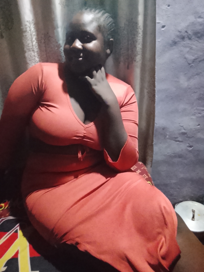 A woman in an orange dress sits indoors, her hand thoughtfully touching her chin. She looks to the left, a gentle smile gracing her face. Behind her, a curtain is partially visible. The wall is a light blueish-grey. A pot and pan can be seen in the bottom right corner. The bedding is multi-colored. The lighting is dim, casting shadows across the scene.