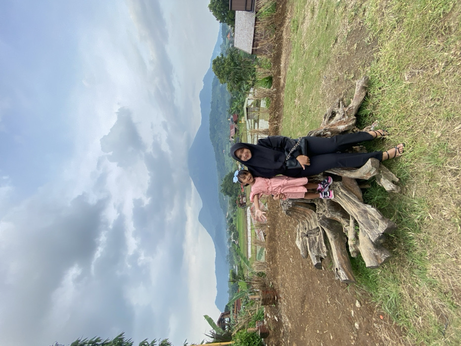 The image displays an adult female and a young girl posing outdoors in Tamiajeng, Indonesia