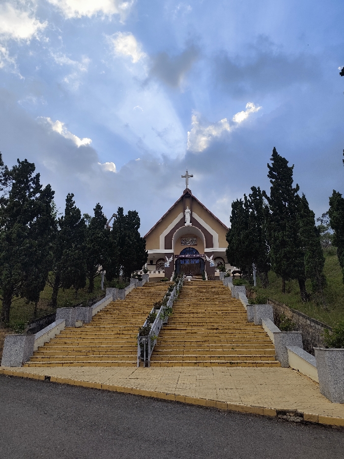 The image displays the Domaine de Marie Church, also known as Mai Anh Church, located in Dalat, Vietnam. The church structure, characterized by a distinct brown-pink and off-white facade, features a steep gable roof crowned with a white cross. A white statue of the Virgin Mary is positioned directly above the central arched main entrance, which contains dark double doors. A long, wide staircase, constructed from yellow-brown rectangular tiles, ascends directly from the foreground to the church's entrance. This staircase is bisected by a central metal railing adorned with planters containing green foliage. Grey, granite-textured balustrades flank the lower sections of the staircase. Tall, slender, dark green cypress or pine-like trees line both sides of the staircase and encircle the church, indicating a hillside setting. The immediate foreground consists of a dark asphalt road transitioning into a lighter-colored, paved yellow-brown area at the base of the stairs. The sky above is partially cloudy, with distinct crepuscular rays emanating from behind the clouds, centered directly over the church. No individuals or active subjects are visible.