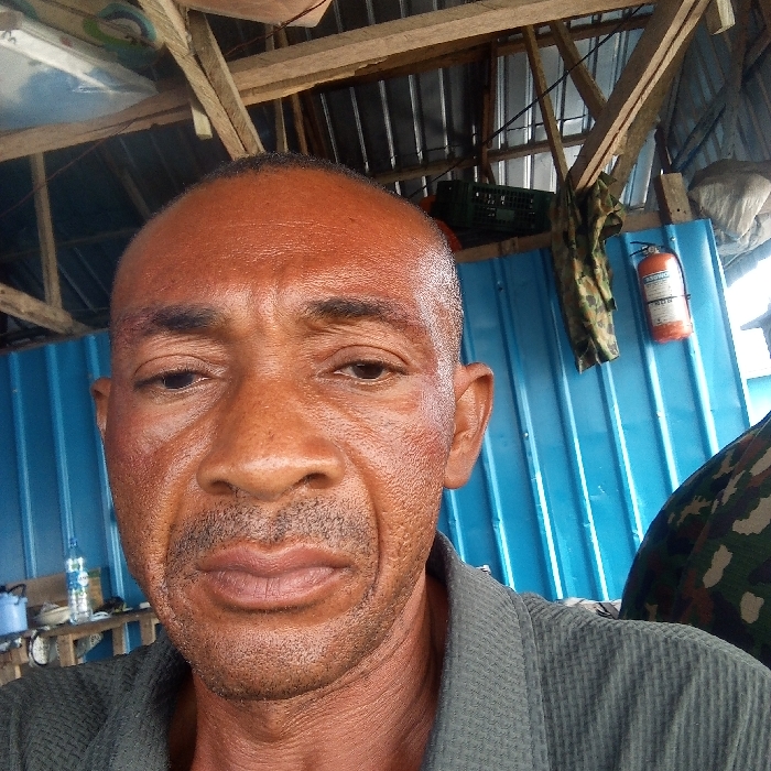A close-up photograph depicts an adult male with a dark complexion, shaved head, and visible stubble, wearing a dark grey/green textured collared shirt