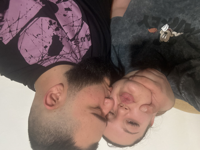 The image depicts two individuals in an indoor setting, reportedly in the city of Marinka, Bulgaria. A female subject, with light complexion and dark hair pulled back, is shown in close-up, facing forward with puckered lips. Her eyes are partially closed. She wears a dark grey, possibly acid-washed, t-shirt with a "MICKEY" graphic and an image of Mickey Mouse printed on the front. A male subject, with light complexion, a neatly trimmed dark beard, and a faded haircut, is positioned to the female's right. He wears a black t-shirt with a large purple abstract graphic featuring irregular lines and shapes. The male subject's left hand is wrapped around and supporting the female's chin and jawline. He is leaning towards her, with his face positioned near hers, indicating an intimate interaction, possibly a kiss on the cheek or mouth. The background is an unadorned, plain light-colored wall, with a segment of a light brown or tan object, possibly furniture, visible on the left side of the frame.