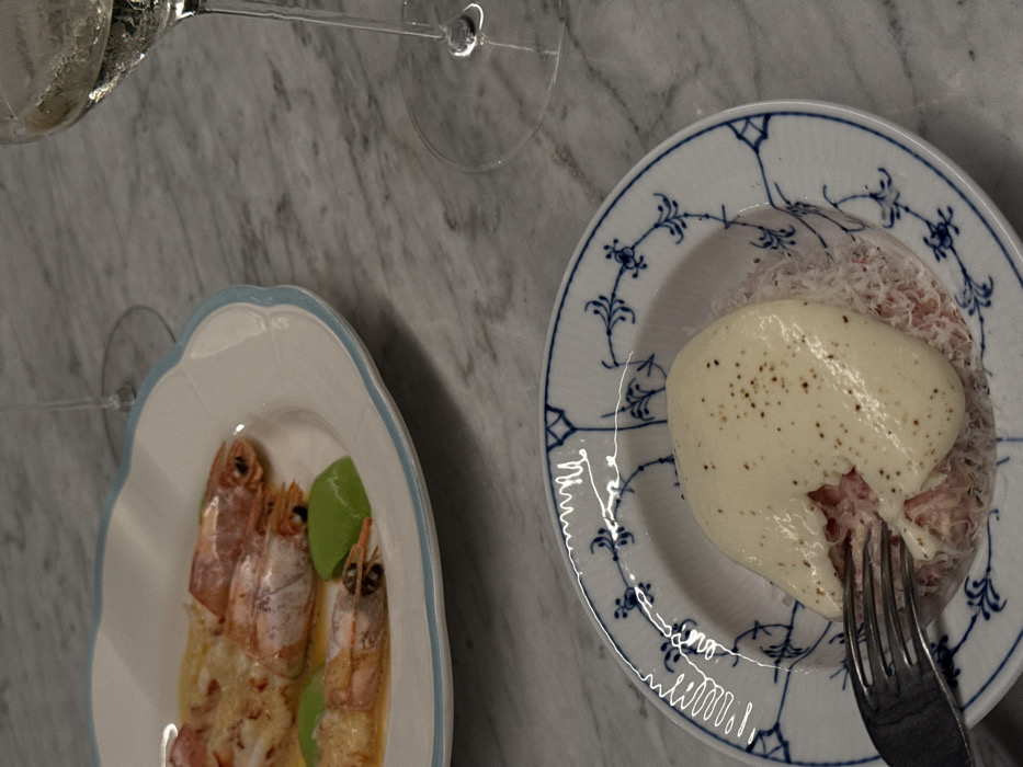 A marble surface displays two plates and part of a wine glass