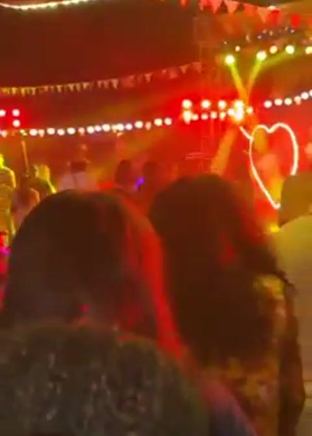 crowd of people at an outdoor event, possibly a concert or party. The scene is brightly lit with red and yellow lights, including strings of lights and a large illuminated heart. People are standing and moving around, many with their backs to the camera. Some are wearing casual clothing. The music is loud. The overall atmosphere appears festive and energetic.