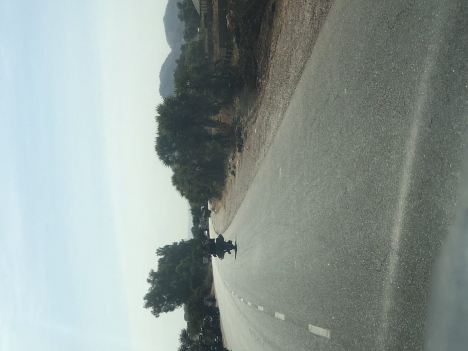 The scene depicts an outdoor environment on a paved road in Bundot, Nigeria, under a clear, bright sky. A dark-colored motorcycle, with at least two individuals riding, is positioned on the asphalt road, moving away from the viewer. The road displays a dashed white line on its left side and curves towards the left in the distance. To the right of the road, a gravel and dirt shoulder is present, with several piles of dark earth visible beyond it. A line of distinct palm-like trees runs parallel to the right side of the road. In the background, beyond these trees, faint structures and a range of hills are discernible. Denser green foliage lines the left side of the roadway. Other vehicles are faintly visible in the far distance along the road's curvature.