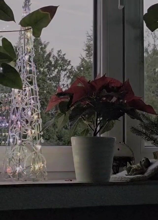 A static indoor shot reveals a windowsill adorned with festive decorations