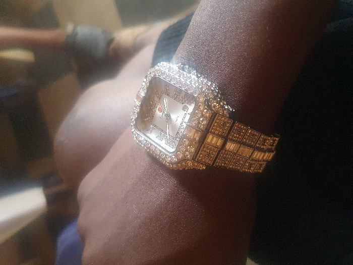 The image displays a close-up, slightly angled view of a person's forearm and wrist, characterized by a dark skin tone. A gold-toned rectangular wristwatch is prominently worn on the wrist. The watch casing and bezel are heavily encrusted with numerous clear, brilliant-cut faceted stones. The watch face is light-colored, featuring two visible hands and a small red emblem, possibly 'Lady Lux', positioned below the 12 o'clock marker. The watch bracelet consists of three rows of gold-toned links, each segment adorned with smaller rectangular and square clear faceted stones. The individual's arm rests upon or against dark fabric, likely an item of clothing. The background is indistinct and out of focus, showing blurry shapes including a blue fabric object in the upper left and a faint outline suggesting another person's lower leg and foot wearing a dark shoe towards the upper right. The scene appears to be set indoors. No specific visual identifiers within the image allow for the determination of a precise location within Manchester, United Kingdom.