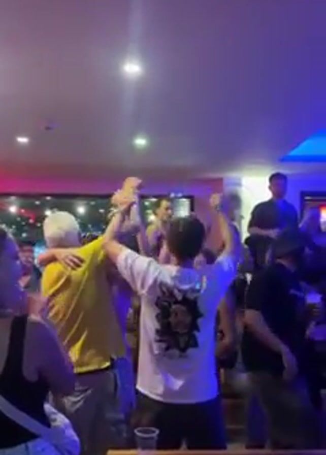 group of people celebrating in what appears to be a bar or club