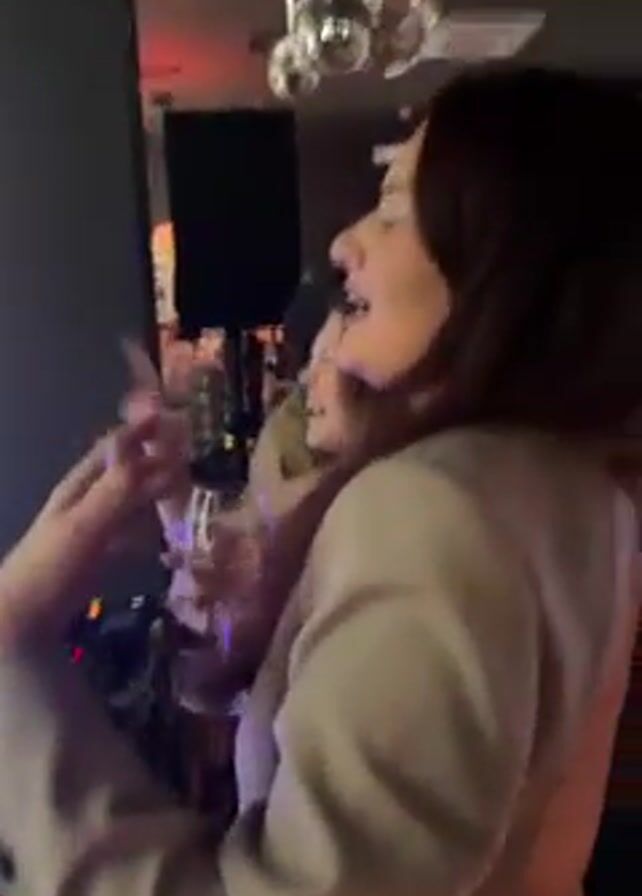 A short video shows two women singing in a crowded club, likely at night. A DJ setup with multicolored knobs and faders is on the left. The lead woman is closest to the camera and on the right. She is light-skinned, with brown hair and dark lipstick. She wears a beige top and appears to be mouthing the words to a song. Her right hand is raised in time with the beat. A fair-skinned woman with blond hair is behind her, also holding a glass. A disco ball is on the ceiling, and lighting gives the room a purplish hue.