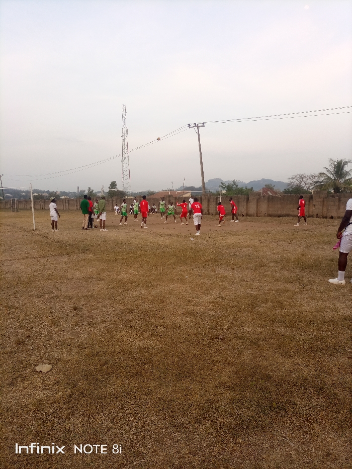 A soccer game is in progress on a dry, grassy field. Players in red jerseys and green jerseys are actively engaged. A ball is airborne in the center of the field. In the background, an electrical tower and utility poles are visible, with foliage and a hillside adding depth. The sky is overcast. A goalpost marks the left side of the frame. The lower part of the image also has "Infinix NOTE 8i" written in bold white letters on it.