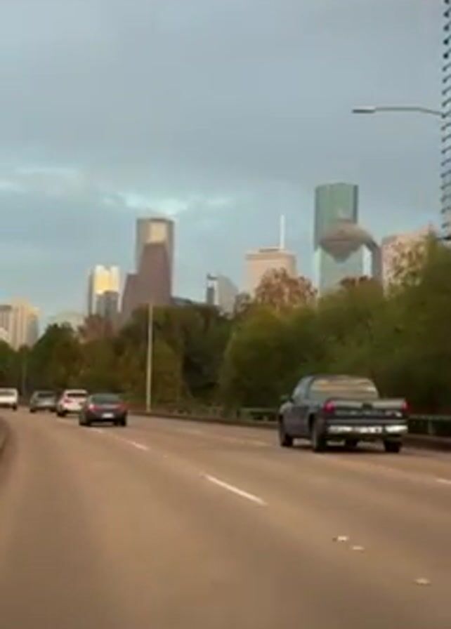 A car drives down a highway toward the Houston, Texas, skyline. The sky is overcast and the highway has other cars on it. There is a line of trees between the highway and the cityscape. The video appears to be shot from inside another car.