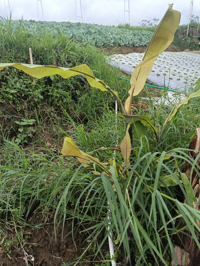 An outdoor agricultural scene in Unknown, Uruguay. The foreground features a young banana plant with yellowish-green leaves emerging from its central stalk, surrounded by dense green grass and patches of dark soil. A white PVC pipe segment is visible near the banana plant's base, and a wooden stake is present in the grass to its left. In the midground, a cultivated field extends with rows of green, leafy plants, likely vegetables such as cabbage. Adjacent to this, another section of land is covered with white agricultural sheeting, from which smaller green plants sprout. The background reveals a framework of metal poles, indicative of greenhouse structures or crop support systems, set against a cloudy, overcast sky. No individuals are present.