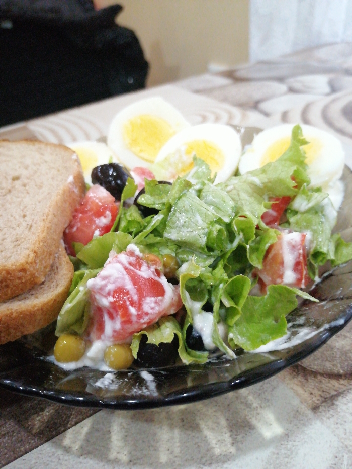 The scene depicts a close-up, elevated view of a prepared meal served on a dark, possibly smoked glass, plate. The plate rests on a patterned table surface, likely in an indoor setting such as a kitchen or dining room, in an unknown city and country. The central subject is a salad composed of chopped green lettuce, diced red tomatoes, whole black olives, and small green elements (possibly peas or green olives), all coated in a white creamy dressing. To the left of the salad, two slices of light brown toasted bread are stacked. Behind the salad, three hard-boiled eggs, each cut in half lengthwise, display their bright yellow yolks and white albumen. The table surface features a light-colored, possibly beige or light brown, material with darker, abstract swirling patterns. The background is blurred, showing a dark, indistinct object that could be an item of clothing or a bag, suggesting the presence of an individual or personal belongings nearby. No specific individuals are discernible in the frame. The food appears ready for consumption.
