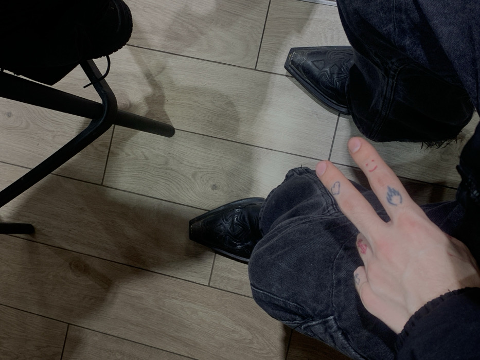 The image captures an indoor scene in Beograd, Serbia, from a high-angle perspective, focusing on the lower body of an individual. The person is wearing dark wash denim jeans and black western-style cowboy boots featuring pointed toes and ornate stitching. The individual's pale-skinned left hand is prominent, forming a "peace" sign with the index and middle fingers extended. Visible tattoos on the fingers include a cloud outline on the index finger, a red smiley face on the middle finger, a small pink marking on the ring finger, and a blue flame on the pinky finger. The floor is composed of light-colored wooden or laminate planks. In the upper right portion of the frame, the dark leg of a chair or table is visible, casting a shadow across the floor. An indistinct dark object is partially visible behind the chair leg.