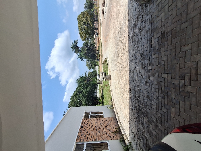 The image depicts an exterior scene in Takum, Nigeria, viewed from beneath an overhead structure. The foreground features a dark grey interlocking brick pavement laid in a herringbone pattern, partially shaded. The rear section of a white vehicle, displaying a red taillight, is visible in the lower-left corner. To the left, a building with white stucco walls and a section of brown and reddish-brown brick cladding is present, featuring multiple windows with white frames. A landscaped area with green grass and several large, light-colored rocks separates the building from a curved, lighter-colored paved driveway or path. The midground and background are characterized by numerous green trees of various sizes and types under a bright blue sky with scattered white cumulus clouds. No individuals are visible, and no discernible actions or interactions are occurring.