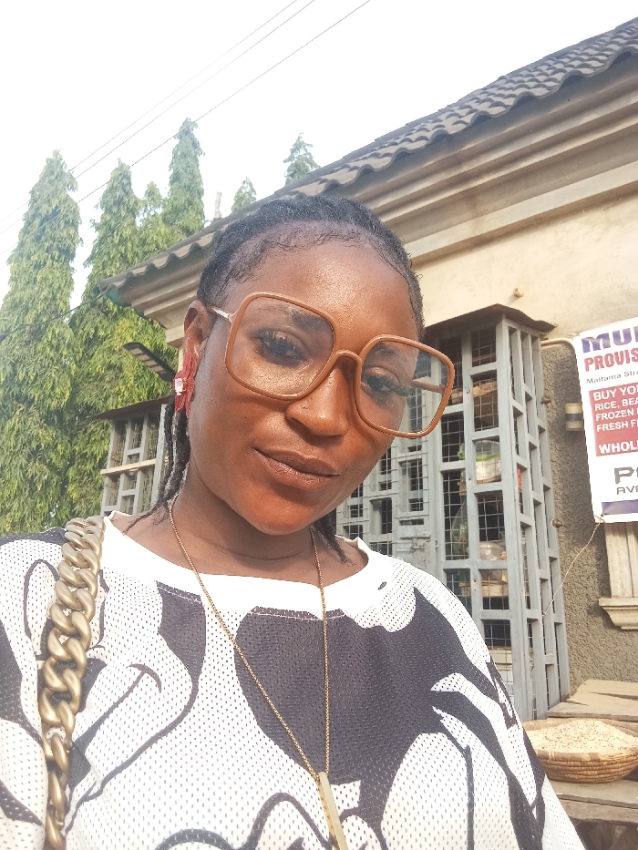 A woman with dark hair and complexion wears large, square, brown glasses. She has a gold necklace and a chain purse. A white shirt with a black abstract print is also visible. Behind her, there is a building with a sign that reads "MU PROVIS" and mentions items such as "RICE, BEAN, FROZEN" and "FRESH FI." In the background, there are tall green trees and an overcast sky.