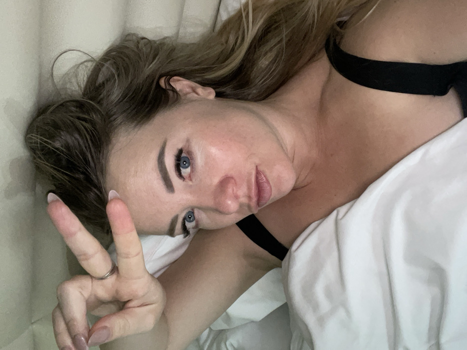A woman lies on white bedding with her head tilted back. She makes a peace sign with her fingers. Her long, blonde hair is tousled. She has fair skin, blue eyes, and full lips. A black strap of fabric is visible near her shoulder. The background is out of focus, suggesting a close-up shot taken indoors. She is wearing a silver ring on her finger.