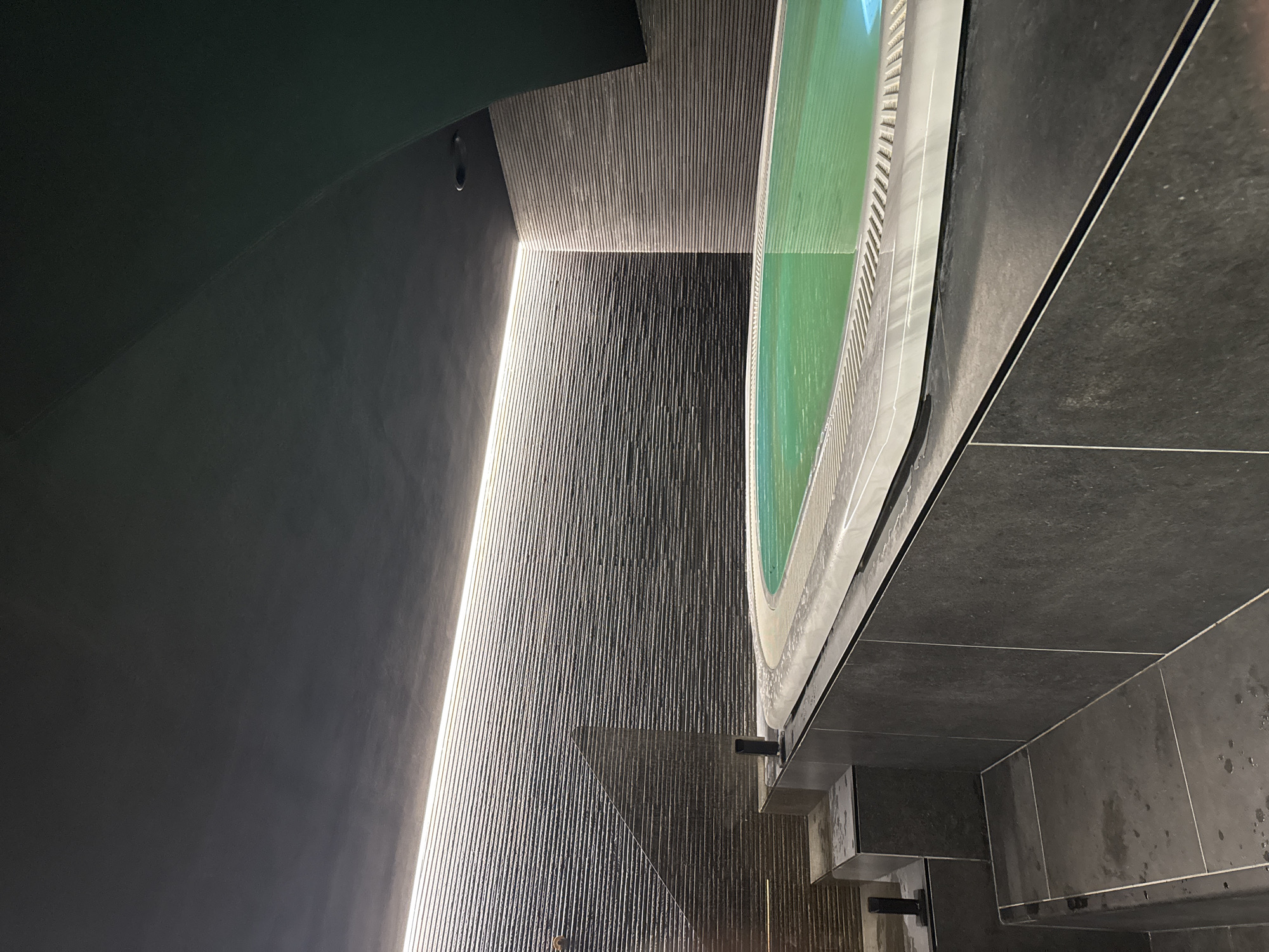 A high-angle, close-up shot shows a modern architectural space featuring a water feature or spa. A dark, textured wall dominates the left side of the frame. To the right of this wall, a cascading water wall made of vertical ribbed material is illuminated by bright vertical strip lighting. A curved pool or spa with green water fills the upper right portion of the image. The foreground consists of dark gray tiled surfaces, possibly forming a pool deck or walkway. The location is not specified and is not determinable from the image.