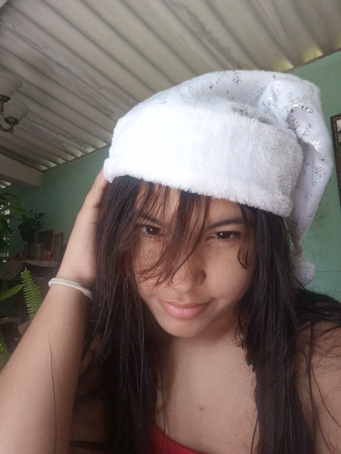 A young woman poses in a selfie. She is wearing a white Christmas hat with silver snowflake designs. Her long, dark hair is partially covering her face. She has a light complexion and is wearing a simple bracelet. The background features a corrugated metal roof and a green wall with a few plants. The lighting appears to be natural and bright. She has a gentle smile and appears relaxed.