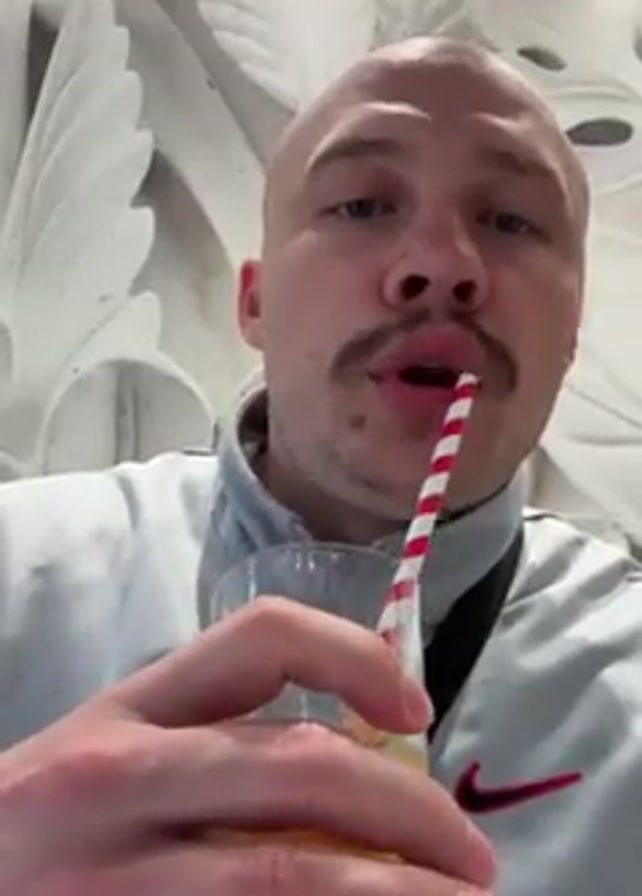 A close-up shot shows a bald man with a mustache drinking orange juice through a red and white striped straw. He is wearing a gray and white jacket with a red Nike logo on the left side. He looks directly at the camera as he drinks. The background features a white, ornate wall design with leaf-like patterns. The setting appears to be indoors, possibly a restaurant or a cafe.