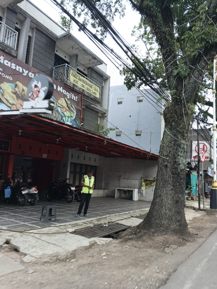 A building with a red awning and a large advertisement is on the left. A person in a yellow vest stands in front of the building. Several motorbikes are parked along the building. A large tree is on the right side, with numerous wires strung above. A street and sidewalk are in the foreground, with a visible drain. The scene appears to be a typical urban street in a tropical location.
