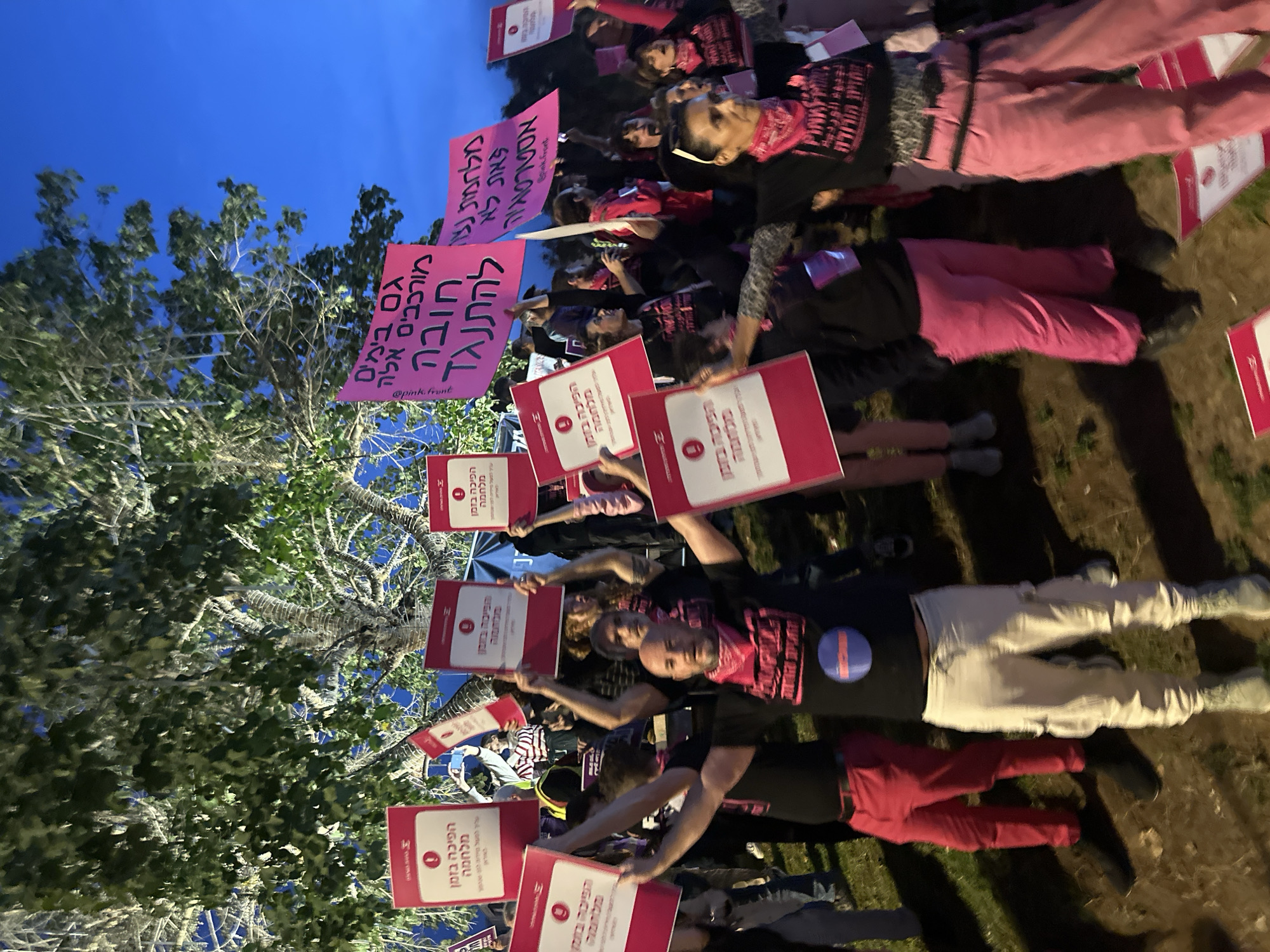 A crowd of people are holding up signs in what appears to be a demonstration. The signs are written in Hebrew and seem to reference a conflict or struggle ("Militant Front") and "a coup in real-time". Some signs are pink and say "We need to resist, also in complicated times". Many of the demonstrators are wearing pink clothing or accessories. The background shows trees and a dark blue or twilight sky, suggesting the demonstration is taking place outdoors in the evening. The ground appears to be dirt. The location is likely in a public space, potentially a park, but the photo doesn't reveal exact details and cannot specifically infer that this image is in Tel Aviv.