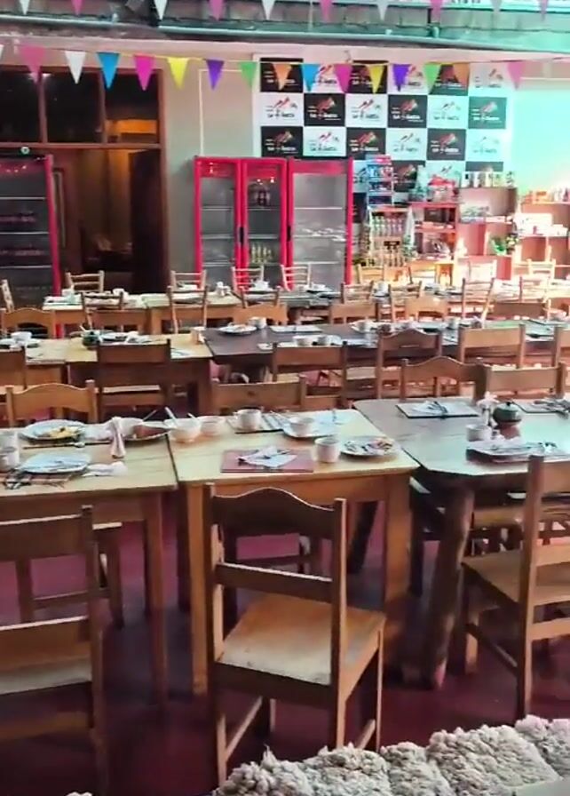 inside of a restaurant. The room is decorated with colorful pennants and has many tables set with dishes and cutlery. The tables are made of wood and the chairs are also wooden. There are two large red refrigerators in the background. Outside the restaurant, people can be seen walking around. In one shot, a person in a black jacket walks by.