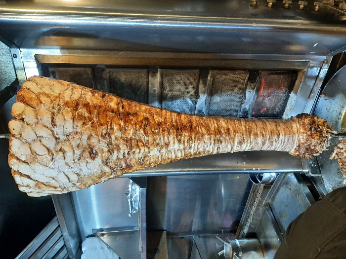 - "A vertical rotisserie of chicken shawarma meat is prominently displayed in a commercial kitchen in Al-Midan Municipality, Syria" by FM-J2D4h2, licensed under CC BY 4.0