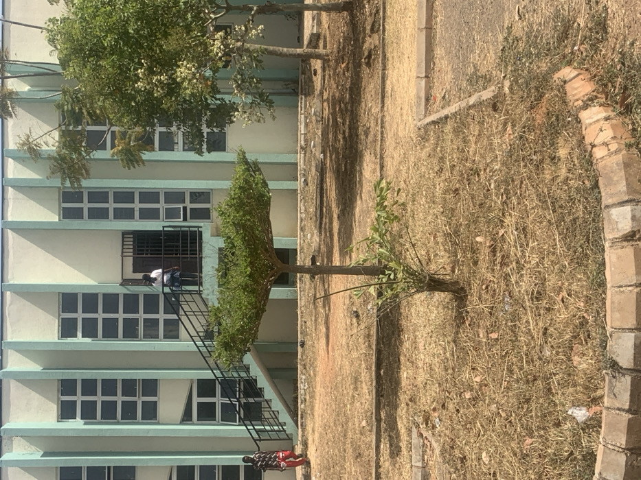 The image captures an outdoor scene in Wumat, Nigeria, centered on a multi-story building with an external staircase and dry ground vegetation