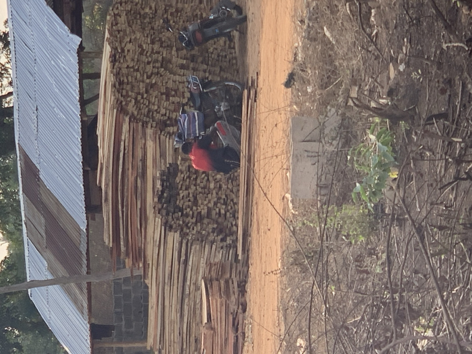 A man wearing a red shirt sits on a motorbike parked beside a large stack of lumber. The lumber is neatly stacked and arranged. A second motorbike is lying upside down on top of the lumber. A building with a corrugated metal roof is on the left. To the right of the lumber and motorbike is a dirt path and some sparse vegetation. A faded cement structure stands near the vegetation.