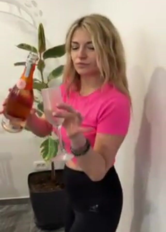 A fair-skinned woman with wavy blonde hair, wearing a pink crop top and black leggings, stands indoors and pours a sparkling pink drink from a bottle into a clear wine glass