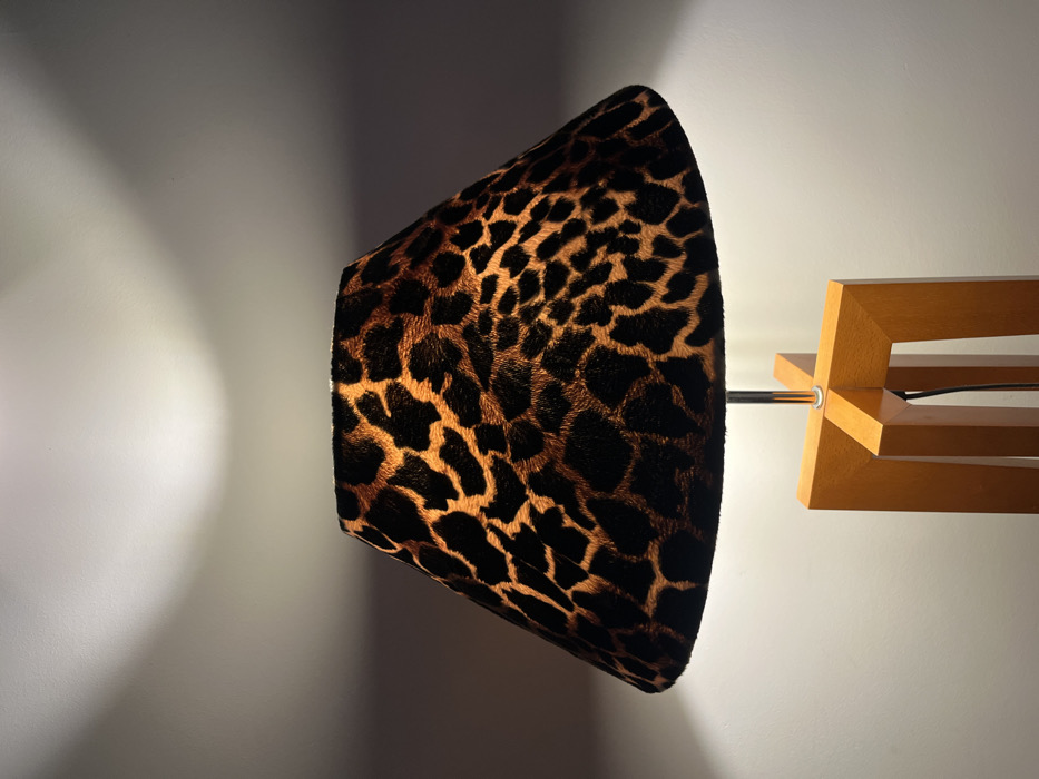 - "An illuminated lampshade with a brown and black giraffe print stands out against a muted wall" by FM-6twaq1, licensed under CC BY 4.0