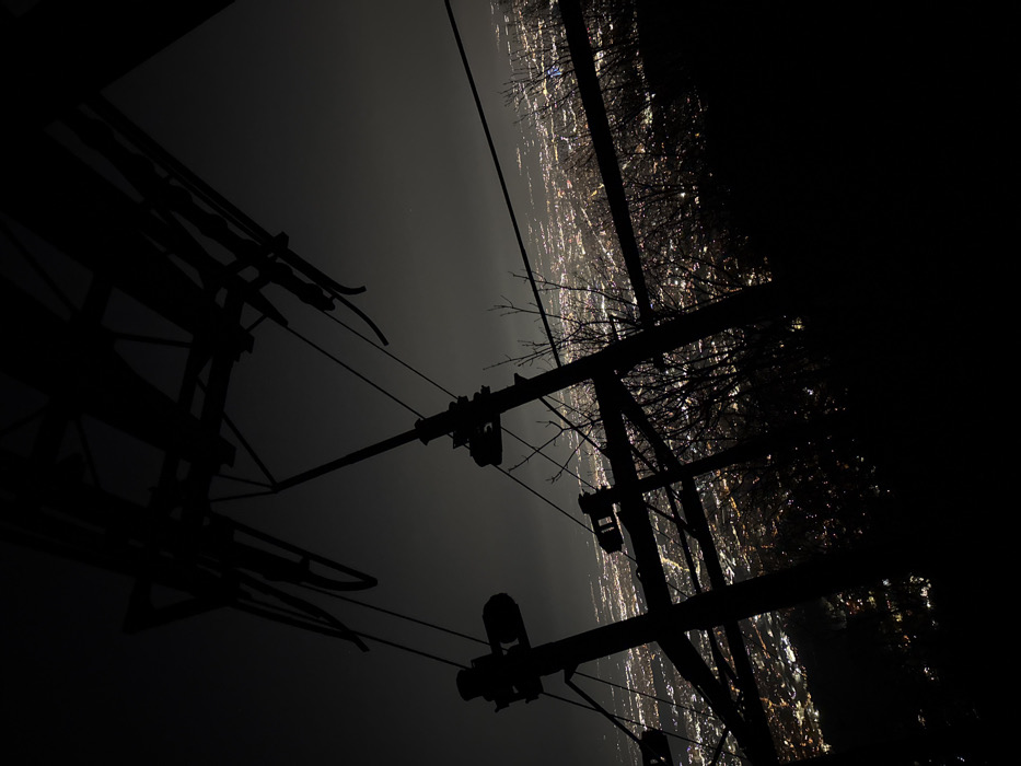 The image displays a nighttime, elevated view overlooking the city of Sofia, Bulgaria, likely taken from Vitosha Mountain. In the immediate foreground, the dark silhouettes of two prominent ski lift pylons, supporting cables, and several suspended ski chairs or gondola elements are visible, starkly contrasted against the lighter background. Additionally, bare tree branches are silhouetted in the lower and middle-right portions of the frame. The background reveals the expansive urban landscape of Sofia, brightly illuminated by a dense scattering of artificial lights that extend across a wide plain. The sky above the city is dark and appears overcast, with a subtle glow near the horizon reflecting light pollution from the city below. No individuals, specific actions, or interactions are discernible within the frame.