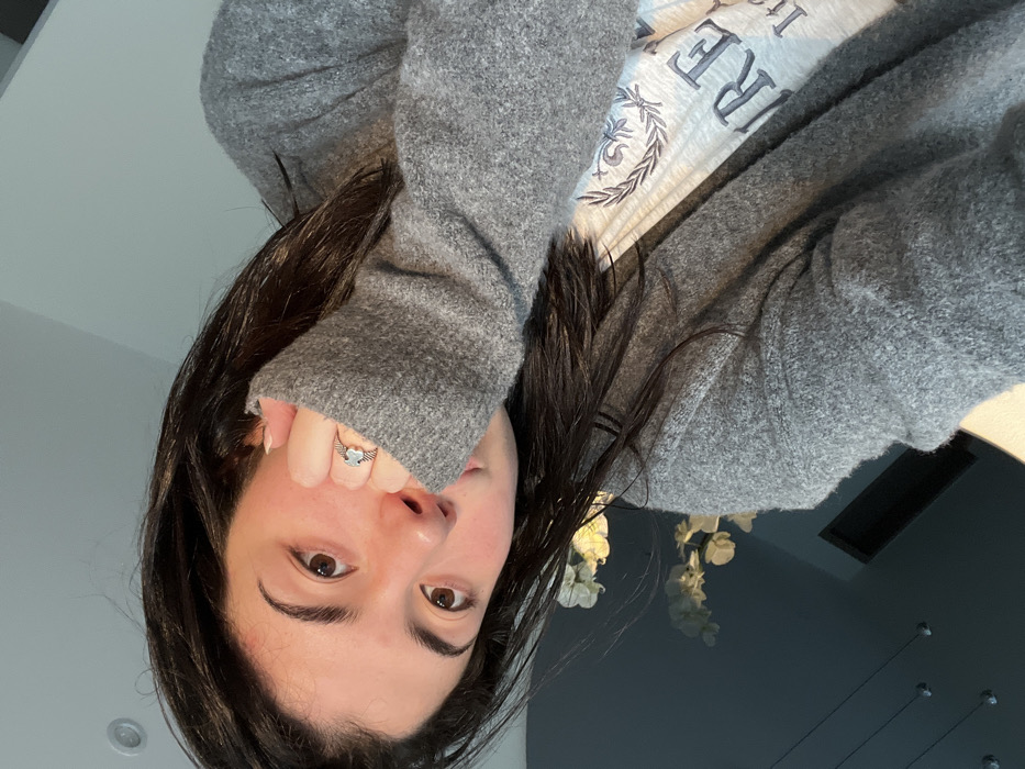 A young woman tilts her head, showcasing dark brown hair and eyes. She wears a heather gray cardigan over a white t-shirt with dark gray writing. A silver ring shaped like a heart with wings adorns her ring finger. The background features a wall, a floral decoration, and hanging lights. The image appears to be taken indoors and is rotated, giving a tilted perspective.