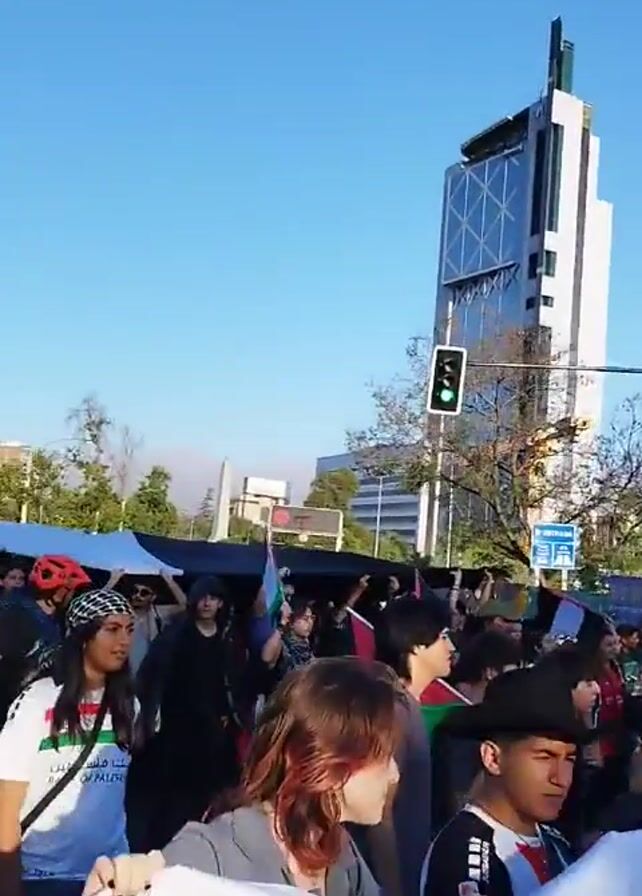 A crowd of people, mostly young adults, are marching down a street in what appears to be a city. They are holding Palestinian flags and a large white banner with dark letters. The crowd is diverse in appearance. They are walking on a paved street under a clear blue sky. In the background, there are buildings including a tall modern building with a green traffic light, a monument with a statue on top, and other city buildings. There are some trees with green leaves. The atmosphere suggests a protest or demonstration.