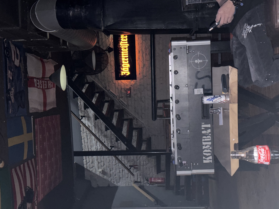 The scene depicts a dimly lit recreational area within an establishment in Plovdiv, Bulgaria. The environment features white-painted exposed brick walls and a dark ceiling from which various national flags, including the US, Swedish, and an English flag branded "CHELSEA," are suspended. A dark metal staircase with wooden treads ascends along the left wall, where a red fire extinguisher is visible on a lower step. A neon orange "Jägermeister" sign is mounted on the brick wall to the right of the staircase, with an "EXIT" sign positioned beneath it. In the midground, a "KOMBAT" branded foosball table, characterized by its silver-grey finish and black handles, is centrally positioned. A target graphic is stenciled on its side. In the foreground, a wooden table holds an empty clear glass Coca-Cola bottle, a shot glass, a white and blue "SHARK" energy drink can, and a black rectangular object. A person is partially visible on the right, seated at the table, wearing dark trousers with white text detailing, and holding a white, elongated object, potentially a vape pen. A dark beaded bracelet is visible on their right wrist. Overhead, two black dome-shaped pendant lights and a black industrial fan are affixed to the ceiling, alongside exposed metal ductwork.