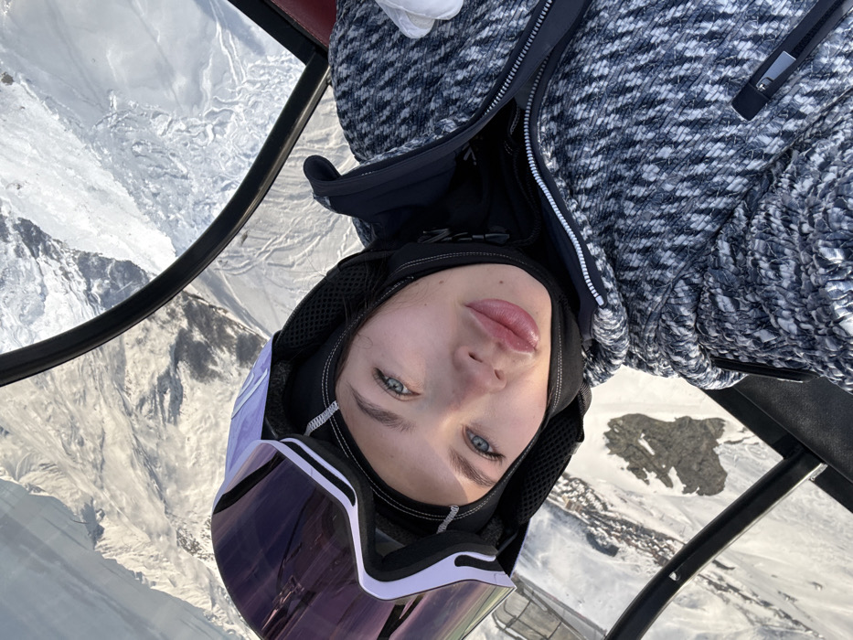 A young adult female is depicted in a close-up selfie, seated inside a ski lift cabin over snow-covered mountains in Saint-Martin-de-Belleville, France