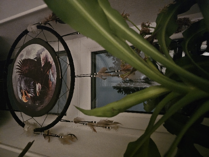 A dreamcatcher featuring an eagle design hangs on a wall near a window, partially obscured by a vibrant green plant
