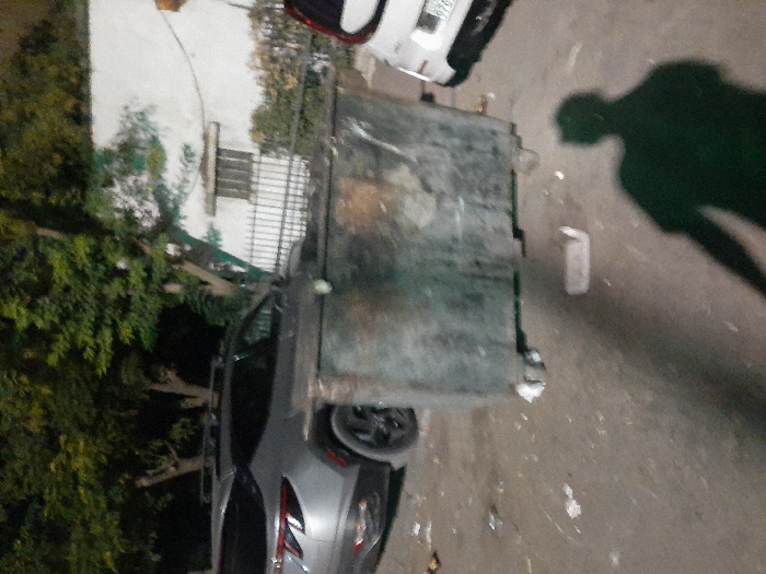 The scene depicts a static outdoor urban environment at night in Al-Midan Municipality, Syria. In the immediate foreground, a large, dark-colored, rectangular metal dumpster with visible wheels occupies the central and left portions. The ground around the dumpster is asphalt or concrete, with scattered white and light-colored litter. A prominent dark human-shaped shadow is cast on the lower right portion of the ground, oriented towards the dumpster, indicating an off-camera light source behind the person taking the photograph. To the left of the dumpster, a silver-grey SUV, possibly a Hyundai Tucson, is parked with its rear section visible, including a dark wheel and roof rails. To the right of the dumpster, a white hatchback is partially visible, showing its rear quarter and a portion of a license plate with characters such as "G76." In the background, behind the vehicles and dumpster, a line of trees with green foliage is present. Beyond the trees on the right, a white building wall is visible, featuring a small window with dark vertical bars and a dark metal fence running along its base. The overall lighting suggests nighttime conditions. No individuals are directly visible within the frame.