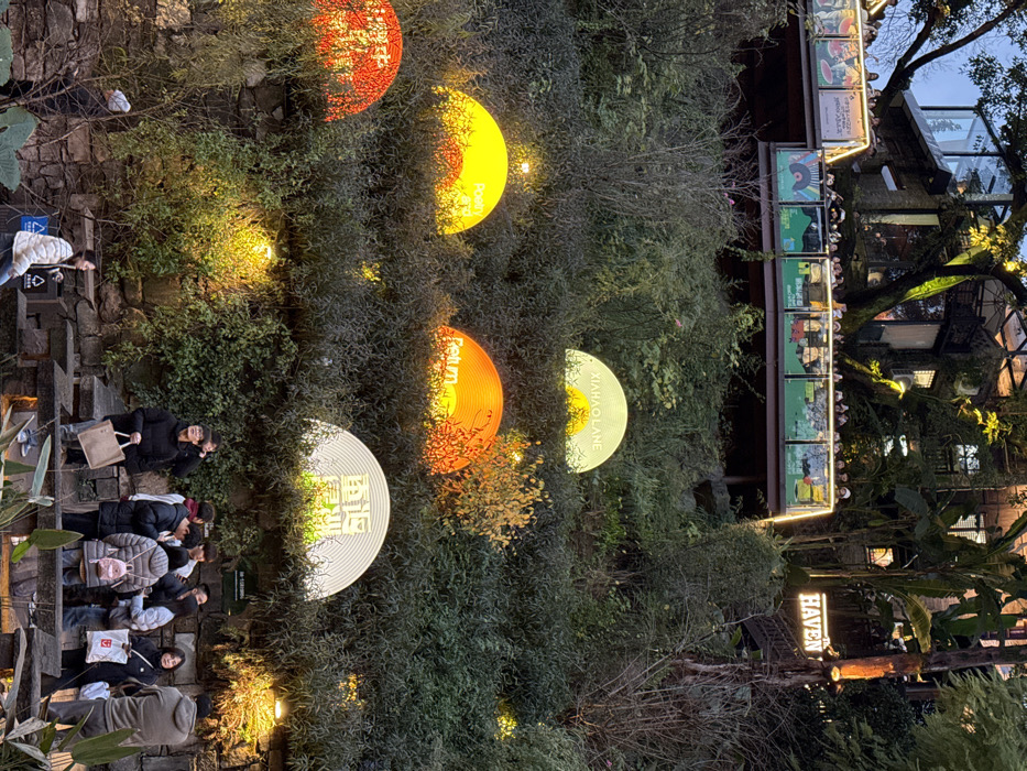 The image depicts a multi-level, illuminated leisure area built into a vegetated hillside, likely in the Nan'an District of China, at dusk or early evening. **Environment:** The scene is dominated by a steep hillside covered densely with various green foliage and trees. Artificial lighting, including spotlights, illuminates the vegetation and structures. Stone retaining walls are visible at the base of the hillside. **Structures:** * **Upper Level:** A modern building with extensive glass elements, including large windows and glass railings on a wide terrace or balcony, is situated atop the hillside. An integrated tree passes through or alongside this structure. A neon sign displaying "HAVEN" is affixed to the building's exterior on the upper right. The terrace railing features decorative panels with graphic designs. * **Mid-Level:** The hillside slope is adorned with five prominent, semi-circular, internally illuminated signs embedded within the greenery. From left to right, bottom to top, these signs display: Chinese characters in red; "Poet" in yellow; "Return" in orange; Chinese characters in white; and "XIAHAO LANE" in a lighter yellow or white. * **Lower Level:** A paved pedestrian area, possibly a walkway or plaza, is present at the base of the hillside, constructed with stone elements and ledges. A dark trash receptacle is visible on the far left. **People:** * **Upper Level:** A crowd of approximately 20-30 individuals is visible standing along the railing of the upper terrace. Their forms are discernible, but individual features are obscured by distance and lighting. * **Lower Level:** A group of roughly 10-15 individuals is gathered on the paved area. They are dressed in casual winter attire. Actions include standing, conversing, and walking. Several individuals are holding shopping bags or personal items. One person on the far left is partially obscured, seated on a ledge.