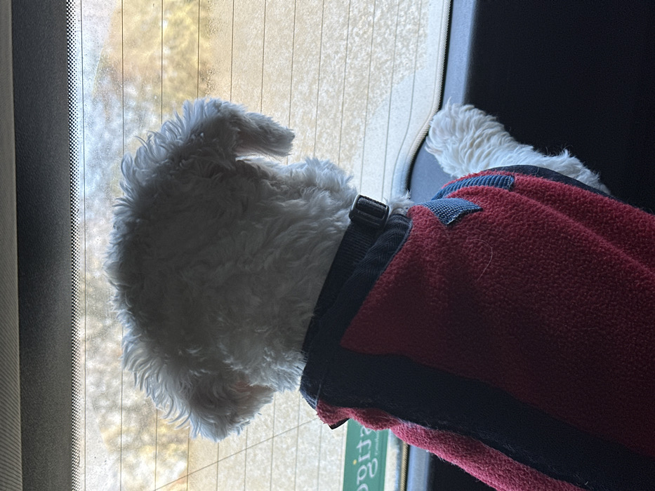 small, white, fluffy dog, viewed from behind, positioned inside a vehicle and looking out through the rear window. The dog has curly fur and wears a two-tone jacket or harness, predominantly red with dark blue trim, and a dark grey collar with a silver-colored buckle. Its white, fluffy tail is visible on the right, resting on the vehicle's dark interior trim. The rear window features horizontal defroster lines. Outside, the environment is blurred, showing what appears to be bare tree branches or sparse vegetation against a light-colored ground, consistent with winter or a dry landscape. Reflected in the lower-left portion of the window is a green sign with white text. The reversed text on the reflection reads "ogita", indicating the actual sign outside displays the word "ATIGO". The specific street or premises associated with the "ATIGO" sign within the West Suffolk district, United Kingdom, cannot be precisely identified from the visual information provided. The scene is consistent with a vehicle traveling or parked on a street or near a commercial area within West Suffolk.