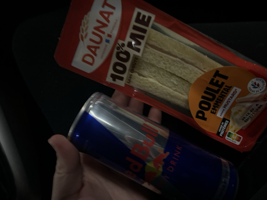 An overhead, close-up image depicts a light-skinned hand holding a Red Bull Energy Drink can and a packaged food item against a dark, indistinct background
