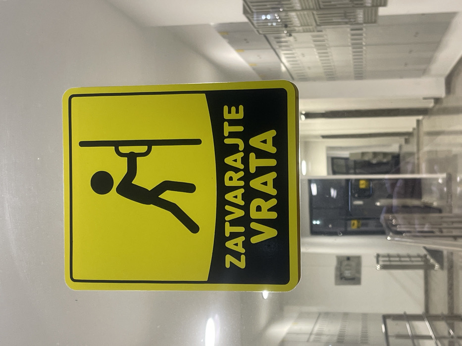 A yellow rectangular sign with rounded corners, featuring a black stick figure pushing a vertical door handle, is affixed to a transparent glass surface. Below the graphic, the text "ZATVARAJTE VRATA" (Close the Door) is displayed in black capital letters on a black background. The sign is centered within the frame. Through the glass, a modern interior hallway in a building located in Bar, Montenegro, is visible. The hallway is well-lit by recessed ceiling lights, which create reflections on the glass surface. To the left, a staircase with a silver-colored metal railing is partially visible. To the right, a wall is lined with numerous rows of light-colored, individual mailboxes or lockers. The background reveals a corridor leading to a further doorway, suggesting a common area within a residential or commercial building.